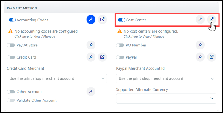 3 In the Payment Method section, click the View/Manage icon for the Cost Center toggle to open the Cost Centers page.