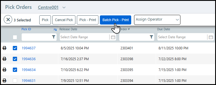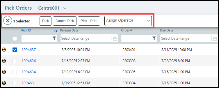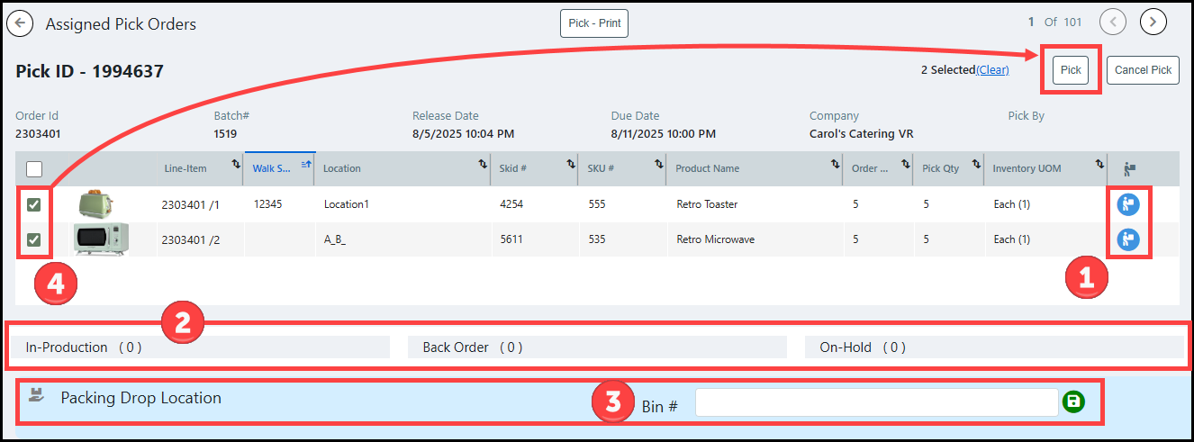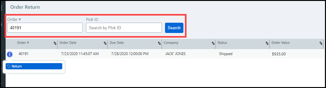 2 Enter the Order # or the Pick ID of the returned order into the appropriate field.