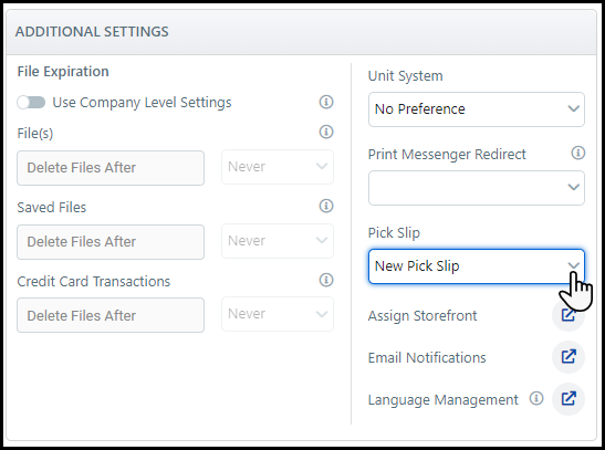 4 Choose the Pick Slip report you want to assign to the company from the Pick Slip drop-down list.