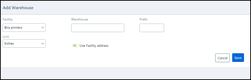 ● Use facility address: The default option is to use the facility's address for the warehouse.