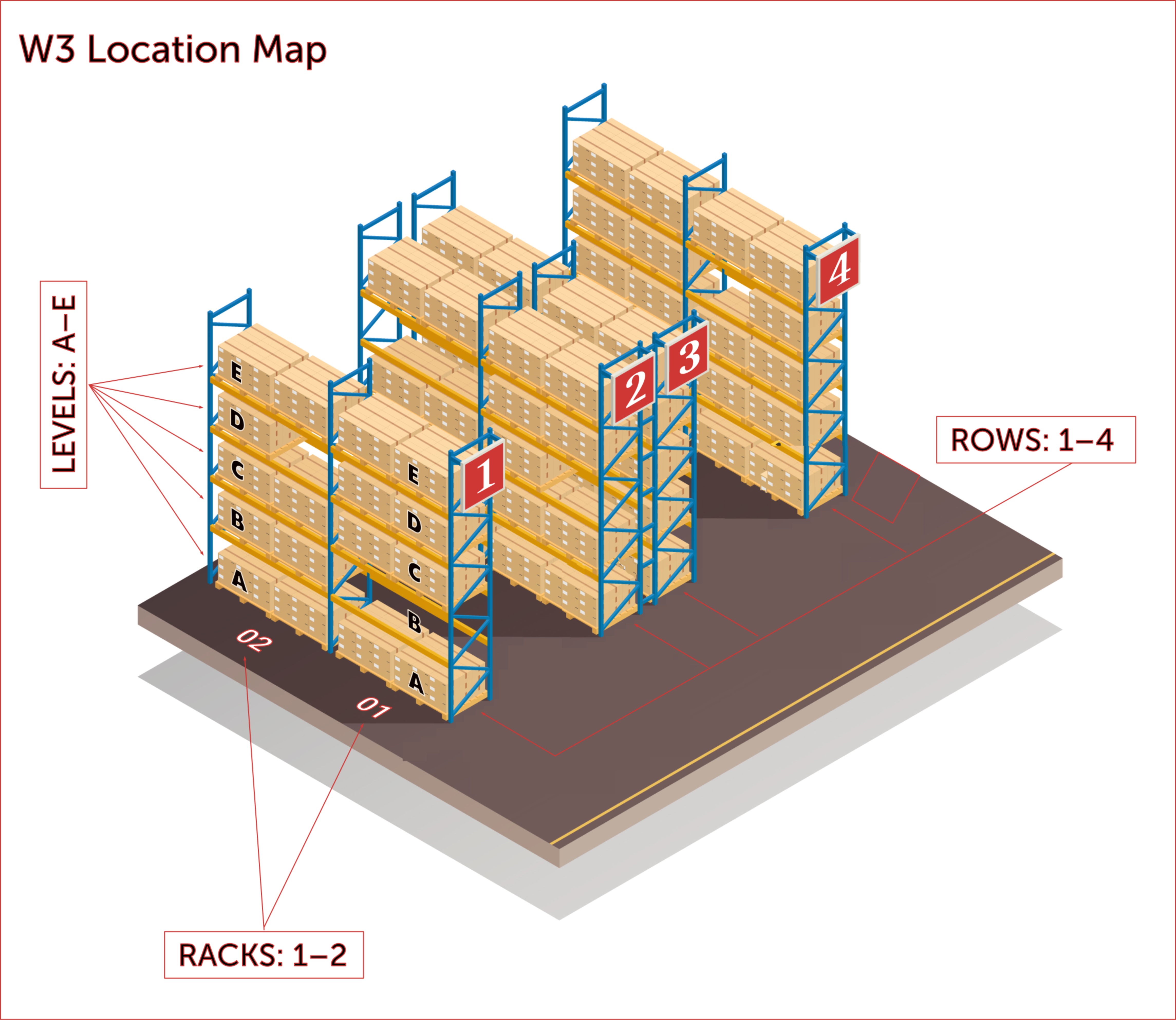 with locations in Rows (or Aisles), Racks (or Bays),