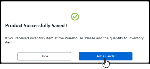 5 Click Add Quantity in the Product Saved Successfully window. This will re-direct you to the Inventory Receive page.