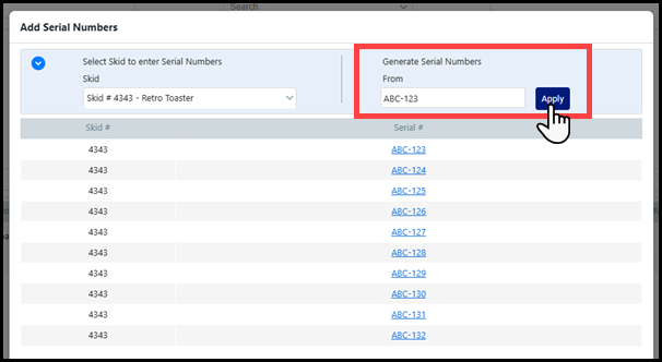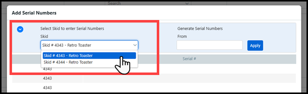 7 Choose the appropriate skid from the Select Skid to enter Serial Numbers drop-down list.
