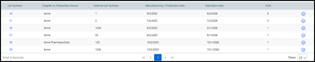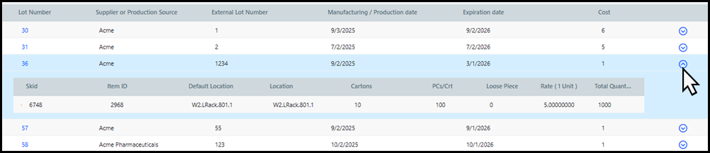 6 Click the down caret in the appropriate row to reveal details about each skid in the Lot.