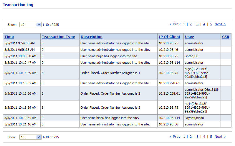 From the Show drop-down list, select the number of items you want to display per page. Use the Next > to move forward and < Prev among pages. Click a column header to sort the log by its value.