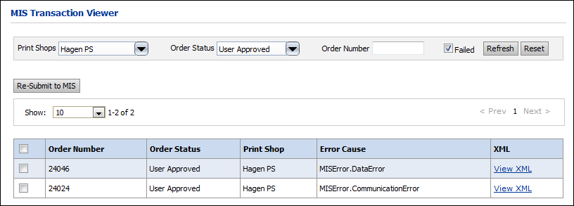 Use this page to review all the orders that were sent to the MIS (for example, Pace or Monarch) with which MarketDirect StoreFront is integrated. In particular, you can review orders that failed to reach the MIS and re-submit those orders to the MIS. To see the relevant list of orders, you must know the name of the Print Shop that is associated with the MIS.