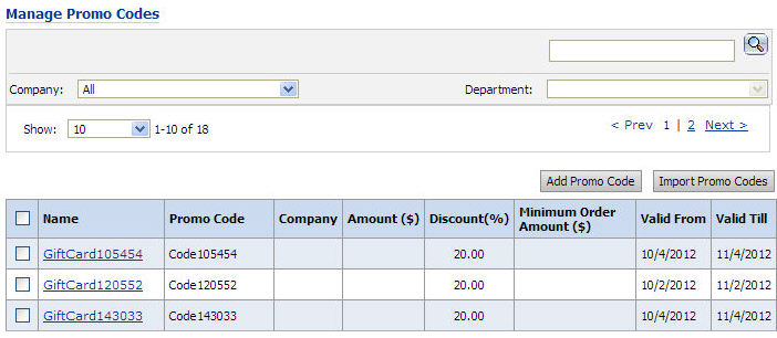 ● Name: Click the promo code name link to open the Manage Promo Codes page on which you can view and edit all details about the promo codes.
