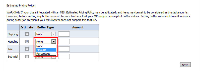 For sites integrated with an MIS: If you want to use the estimated pricing feature, make sure that your MIS supports receiving buffer values. If it does not, you can use estimated pricing (e.g., to designate a bucket such as shipping, handling, etc.) as estimated, not actual, but leave the Buffer Type option set to None so you cannot enter an amount. The message will still be displayed in checkout in this case, but no additional buffer amounts will be added to the order.