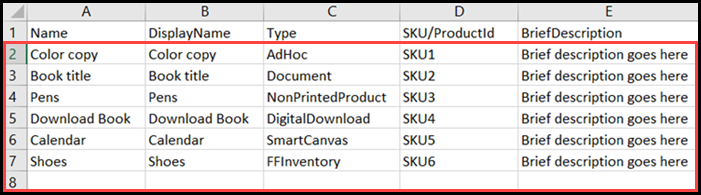Type: Enter one of the six supported import product types: AdHoc, Document, NonPrintedProduct, DigitalDownload, SmartCanvas, and FFInventory