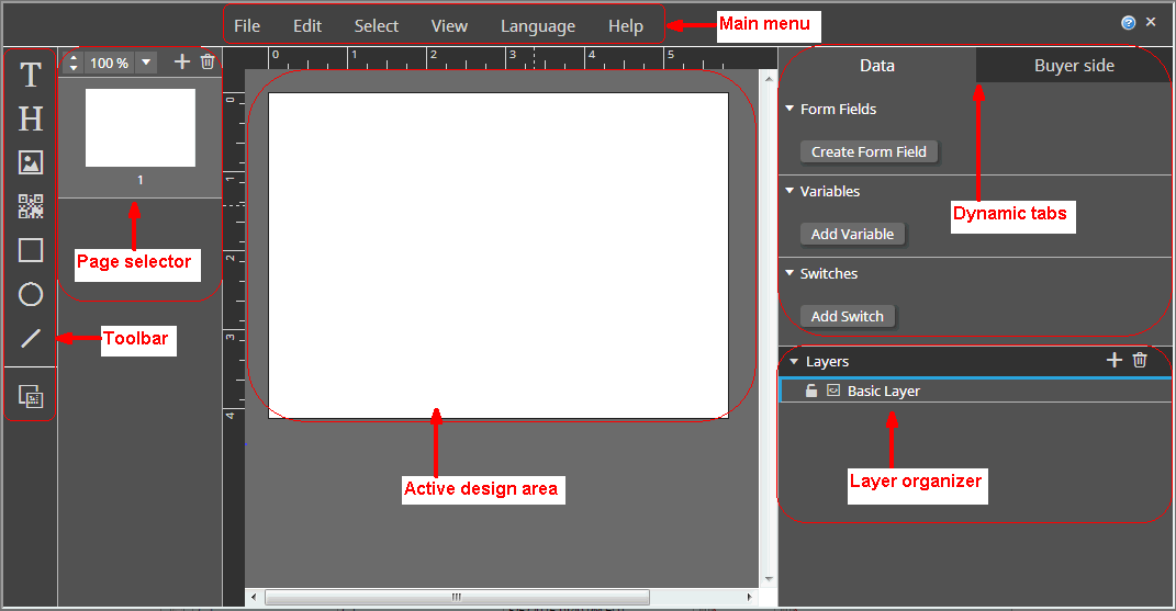 The table below is a guide to the main menu of the SmartCanvas template designer: