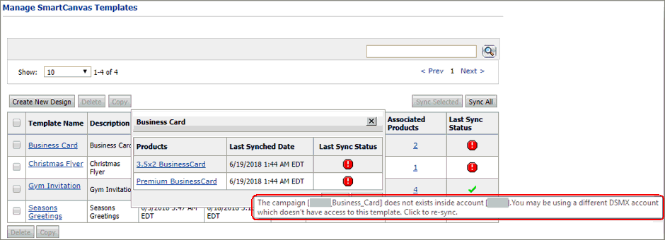 ● In the event of any failure in synchronizing the changes, MarketDirect StoreFront will display an error icon in the Last Sync Status column of the corresponding template. In this case you can: