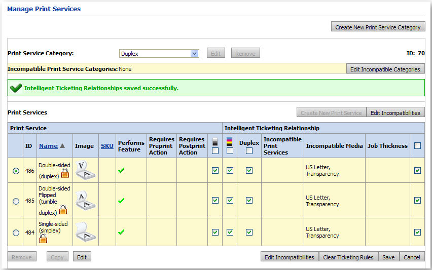 an intelligent ticketing relationship incompatibility rule1 On the Manage Print Services page, select the Print Service Category with rules you want to remove.