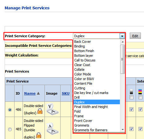 Print Service Categories list).