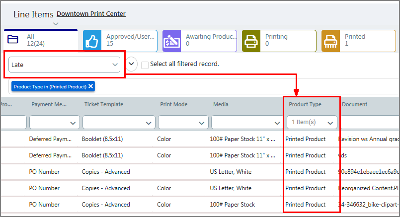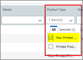 Type of product. To filter this attribute: In the column header field, select an option from the drop-down list to show only Printed Product or Non Printed Products. |