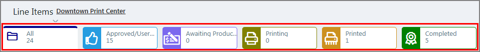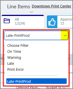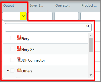 Output device associated with the job. To filter this attribute: In the column header field, select an option from the drop-down list. You can edit this attribute for each line item by clicking the pencil icon in the field and selecting an option from the drop-down list. |