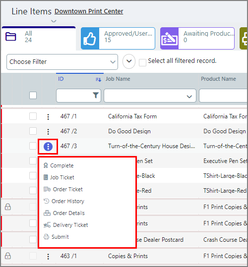 Opens the quick access menu that lets you perform the following job management tasks for each job in the jobs table: ● Submit ● Complete ● Job Ticket ● Order Ticket ● Order History ● Order Details ● Delivery Ticket |