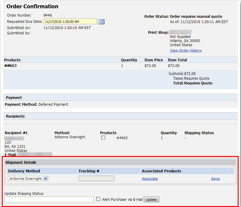 You can enter shipment tracking numbers that can be used to view tracking information for a shipment to an order recipient. You can enter multiple tracking numbers per shipment in cases where multiple packages are being shipped with separate tracking numbers assigned.
