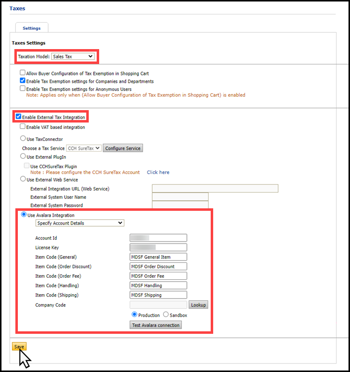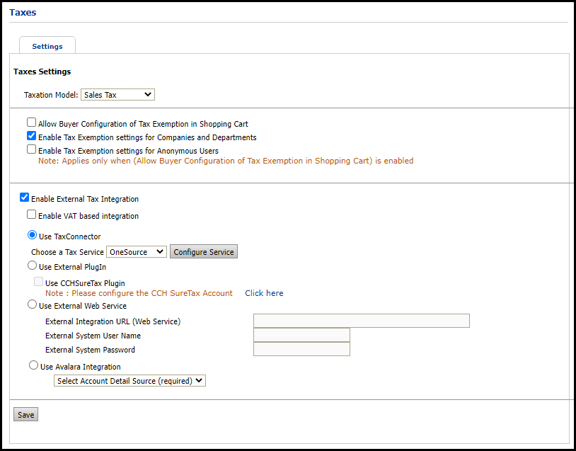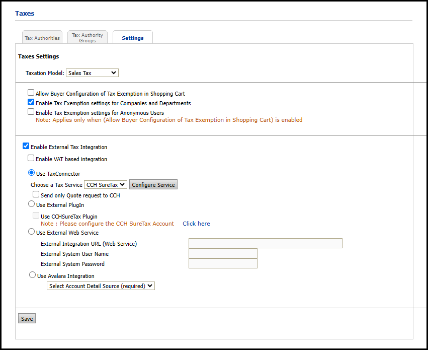 SureTax MarketDirect StoreFront enables integration with CCH SureTax through the External Tax Connector. CCH SureTax will calculate the tax based on the details of the order, such as order gross amount, products, and the local tax governing authorities for the shipping origin and destination.