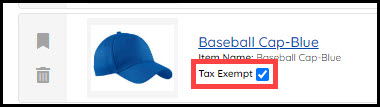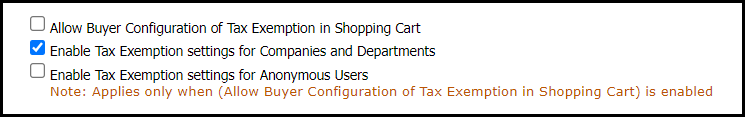 ● Allow Buyer Configuration of Tax Exemption in Shopping Cart: Select this option to give buyers the option of designating each line item in the shopping cart as Tax Exempt.
