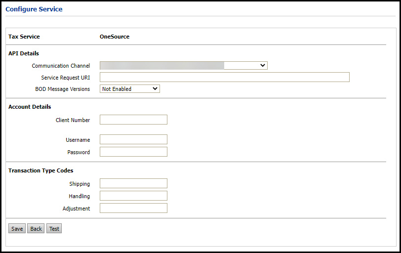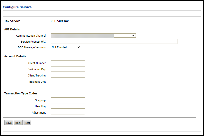 Tax service credentials (Service Request URL, Account Details, and Transaction Type Codes) will be provided by CCH SureTax.