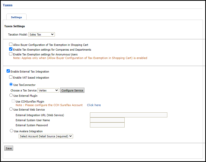 External Tax Models: Integration with a third-party dedicated tax system, which takes in account recipient addresses and buyer addresses. Click here for information on integrating your site with an external tax model.