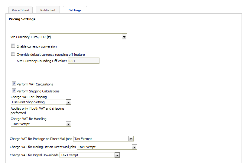 For more information on VAT settings at the Print Shop level (i.e., on the Print Shop) page, see Taxation Model at Print Shop Level.