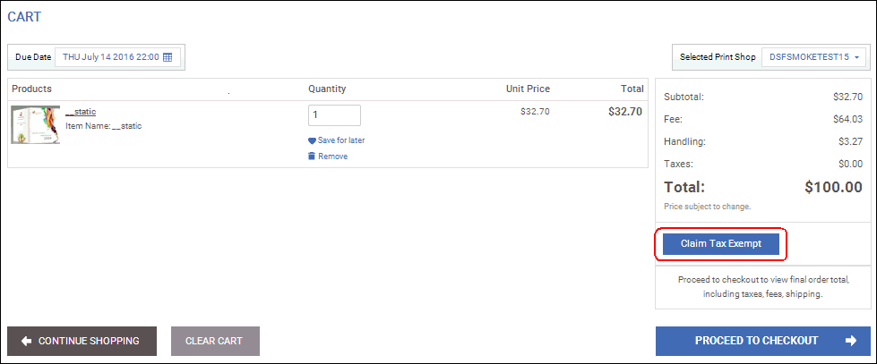 Built-in Sales Tax Model: The tax amount is based on the Print Shop and rudimentary tax rates. Click here for information on setting up your site on the sales tax model.