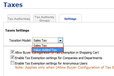 ● In the VAT section, scroll down to the Shopping Cart Settings section and choose which Taxation Model to use for the print shop.
