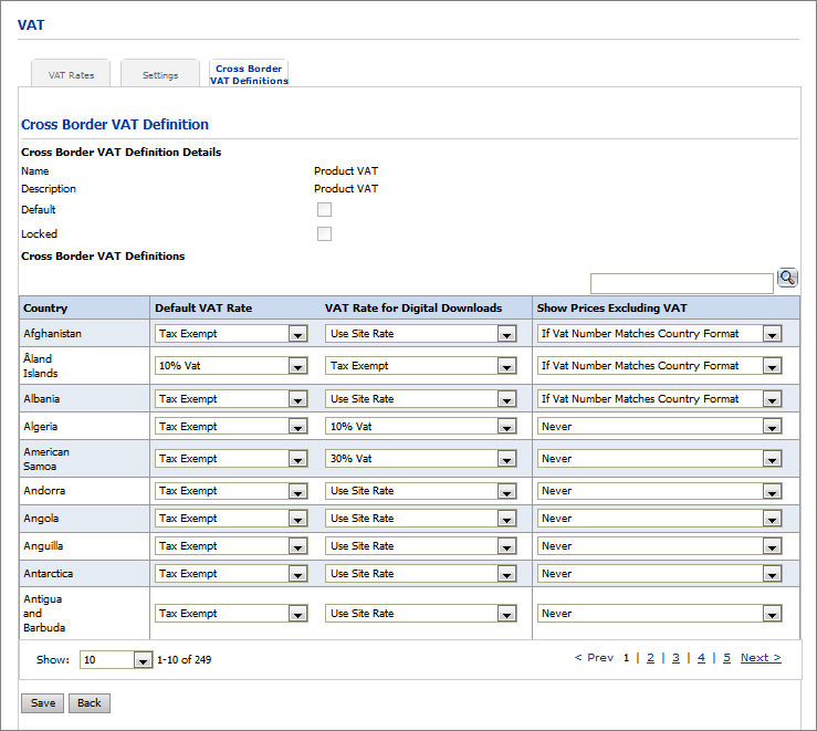 Cross Border definitions accommodate the need to have different VAT rates for different countries (i.e., cross border VAT). Within the European Union the VAT number is validated against the European Commission Web Service. For other countries the VAT number can be validated against a regular expression set at the countries level. You can define cross border VAT definitions that let you define rates based on the country to which a product is shipped at the Print Shop, product, or delivery method level.