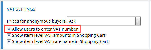 ● In the VAT SETTINGS section, enable the Allow users to enter VAT number option to allow buyers who self-register on the site to enter their VAT numbers and have them associated with their profile and utilized during the ordering process.
